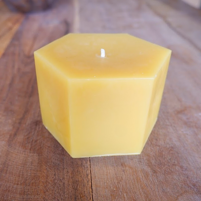 This all natural beeswax hand poured hexagon pillar candle will warm and brighten your home with it's long and pure burn. Each pillar candle is made of the finest beeswax, giving it air cleaning traits and a delightful gentle natural honey aroma. This unique shape is special to Candlestock. Add one or many to any tabletop for a bright, warm and purifying centerpiece. Great for wedding table centerpieces.