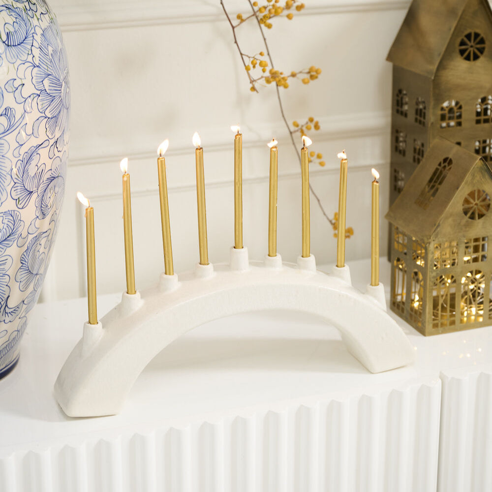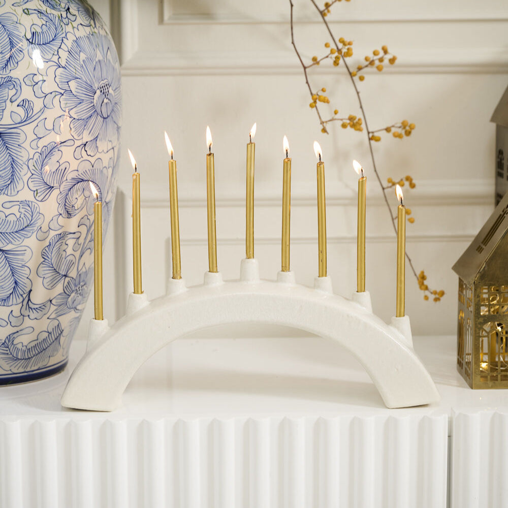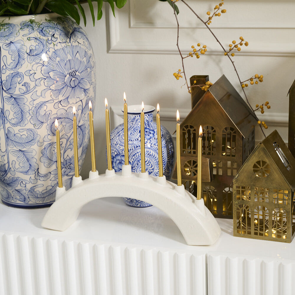 Celebrate Hanukkah with the Ceramic Arch Menorah, a beautiful blend of tradition and modern design. Its arch shape and off-white reactive glaze create a sleek, sophisticated look that brightens any space. Raised candle holders and a slightly taller center spot make lighting the candles easy and elegant. Perfect for adding a cheerful, artful touch to your holiday festivities.