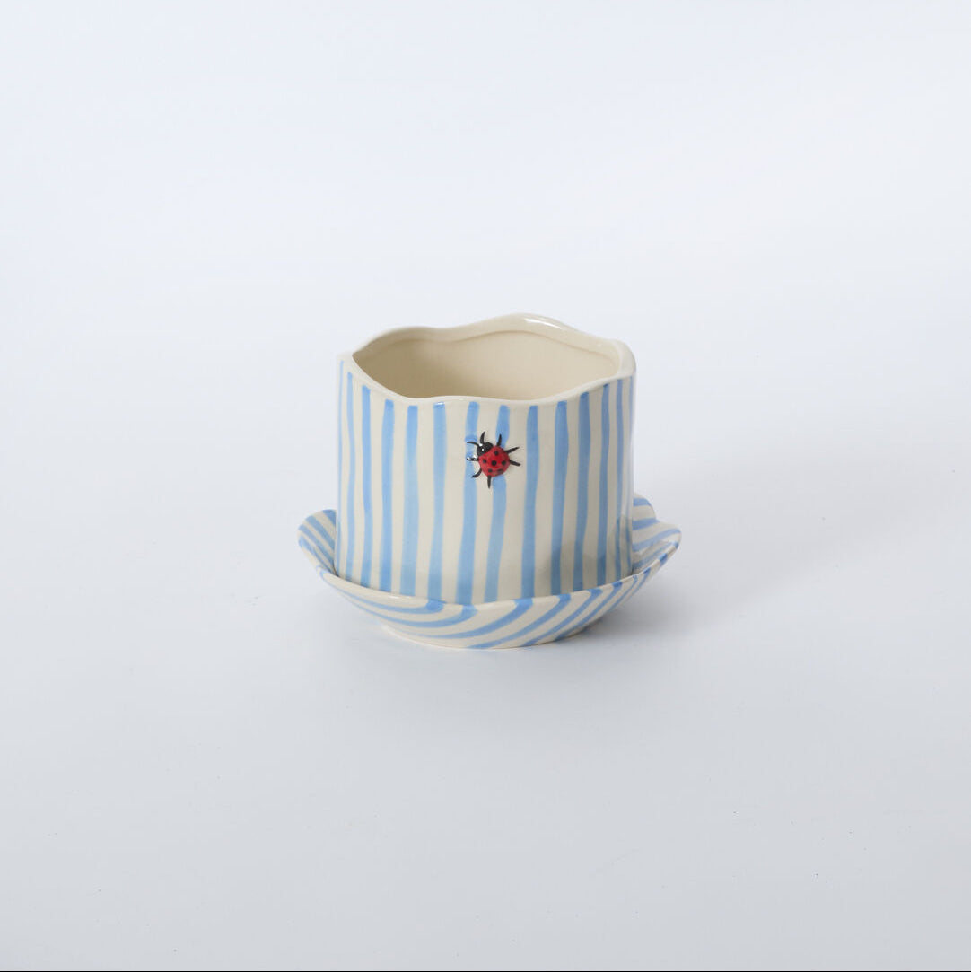 Bring whimsy to your space with this adorable ceramic ladybug planter! Featuring cheerful blue and white hand-painted stripes and a dimensional ladybug perched near the wavy rim, it's the perfect cute accent for any room. The glossy finish catches the light beautifully, while the matching curved saucer keeps your surfaces protected. Whether you're displaying succulents, herbs, or small flowering plants, this playful planter adds instant charm and personality to shelves, desks, or windowsills. A delightful way to celebrate nature's sweetest details!