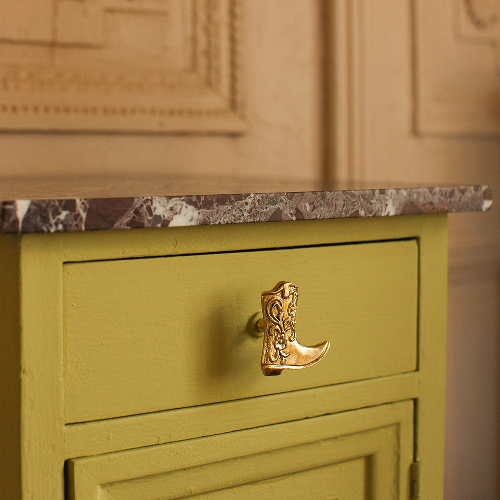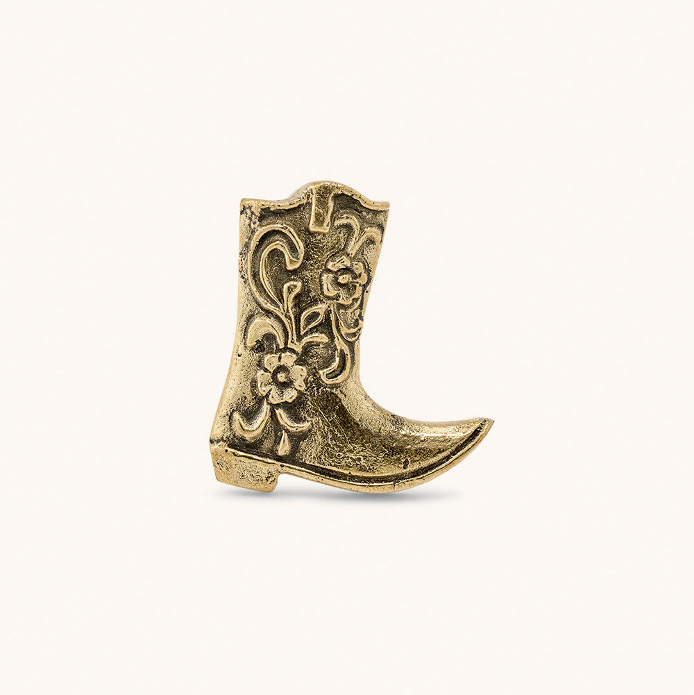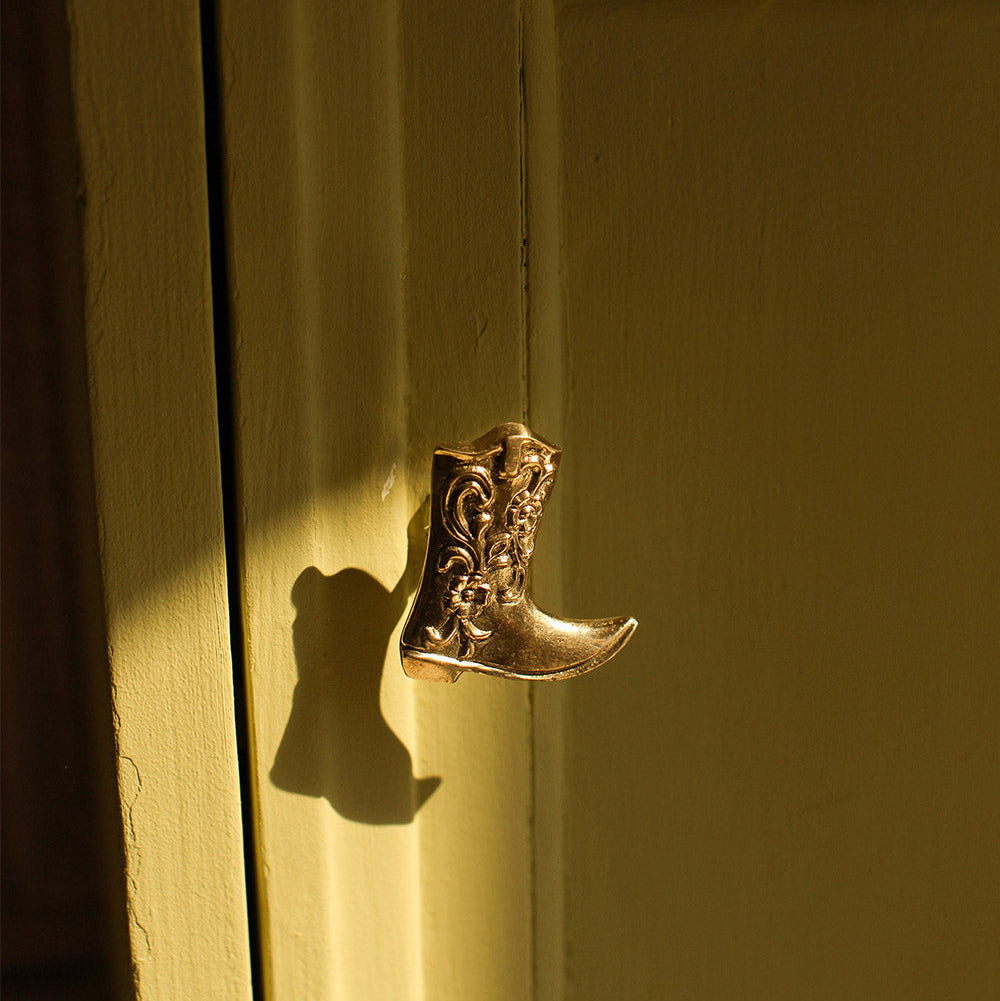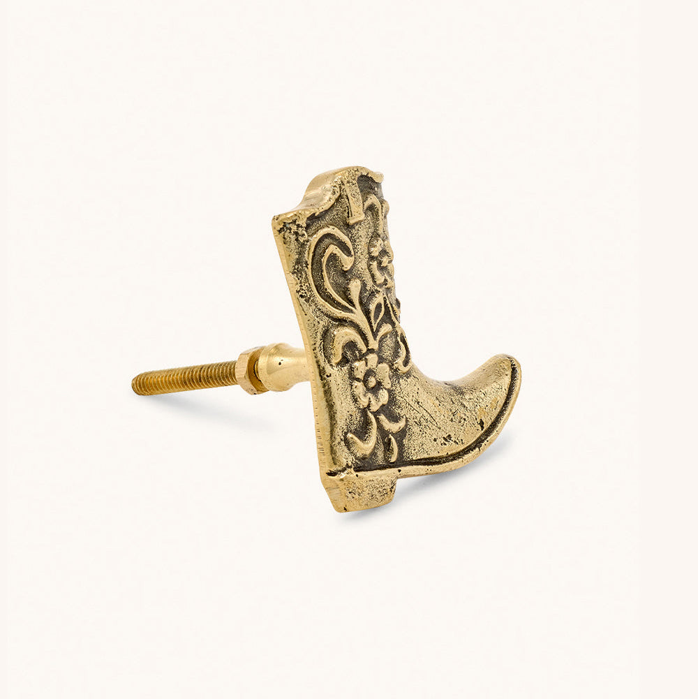 Transform your furniture with the Brass Dallas Cowboy Boot Knob—a handcrafted piece of Southwestern artistry. Each knob features intricate boot detailing cast from recycled brass, bringing authentic frontier character to dressers, cabinets, and doors. Skillfully made by Indian artisans, every knob is one-of-a-kind with its own unique personality. More than just hardware, it's a decorative statement that adds rustic charm and eco-conscious style to any room.