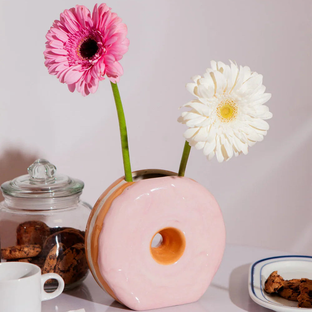 Add a cheerful blast of retro fun to your space with this Ceramic Donut Vase. Its classic donut shape captures the lively spirit of 1950s diners and vintage fast-food vibes. An ideal way to brighten any room, it creates a joyful centerpiece that’s as playful as it is charming.