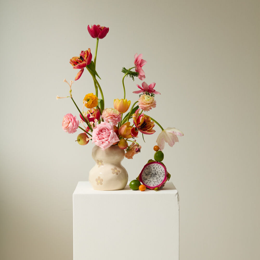 Add a touch of playful elegance to your home or event displays with the Ceramic Petunia Vase. Featuring a glossy finish, curvy silhouette, and natural bisque flowers peeking through the creamy glaze, this warm neutral vessel is perfect for any floral color palette. Easily arrange and maintain your flowers with the removable lid.