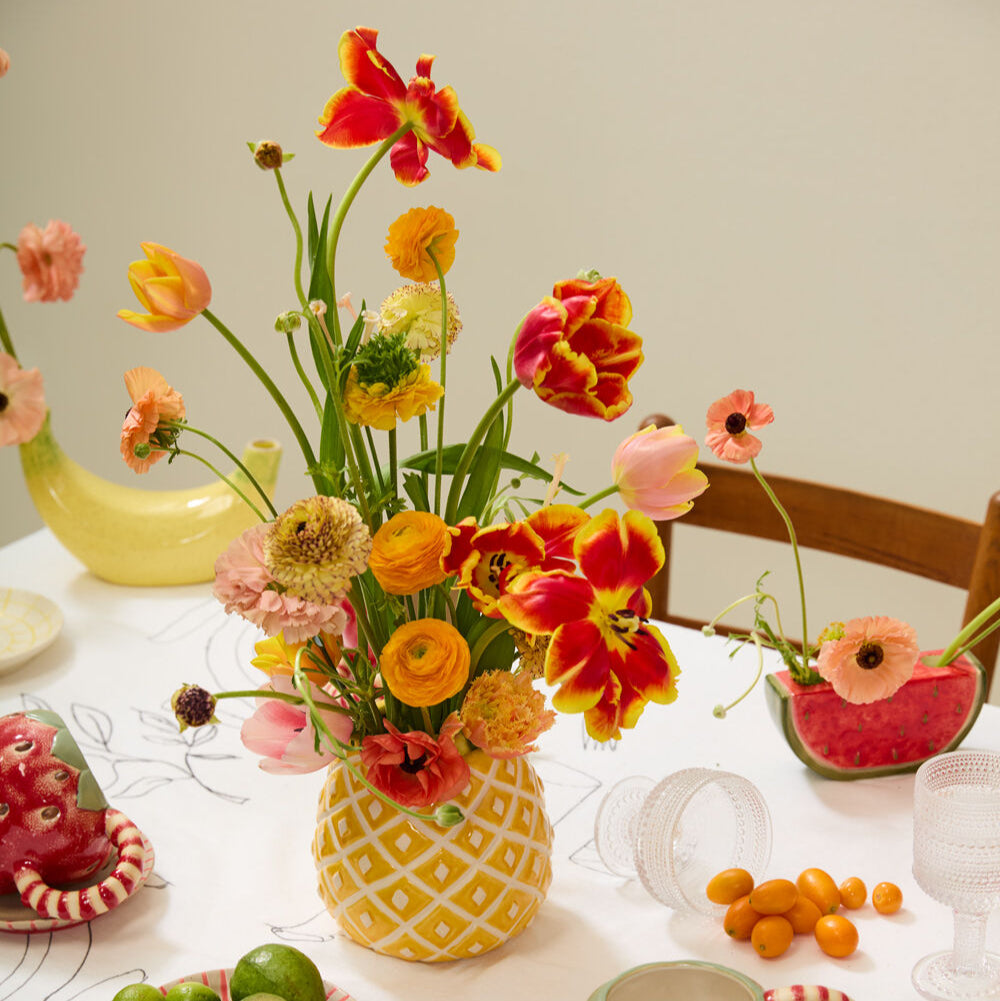 Add a playful touch to your home decor with the Ceramic Pineapple Vase. The dimensional hand painted design features diamond shapes, texture, and eye-catching colors. Use with tropical florals or add a burst of green with foliage. Coordinate with our fruit-inspired tableware for a fun, summery look.