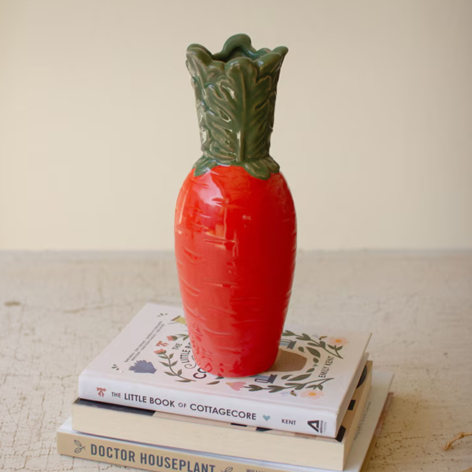 Brighten your kitchen with this cheerful 10" tall ceramic carrot vase. Its vibrant orange hue brings a fresh, natural touch, perfect for displaying greenery or standing beautifully on its own. Add a playful splash of color and charm to any space with this unique, eye-catching accent.