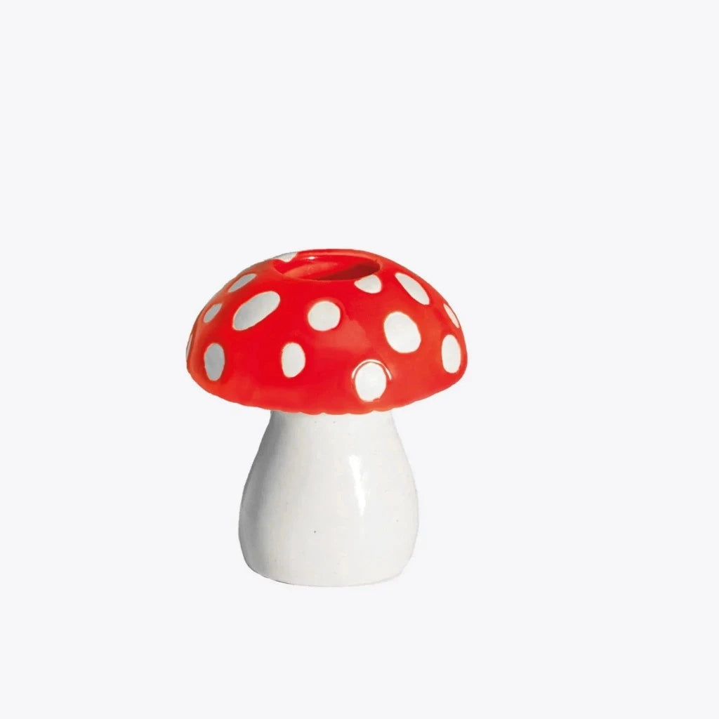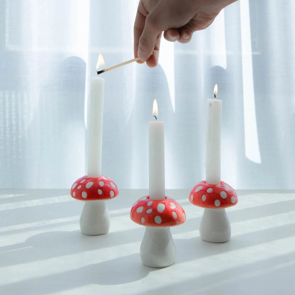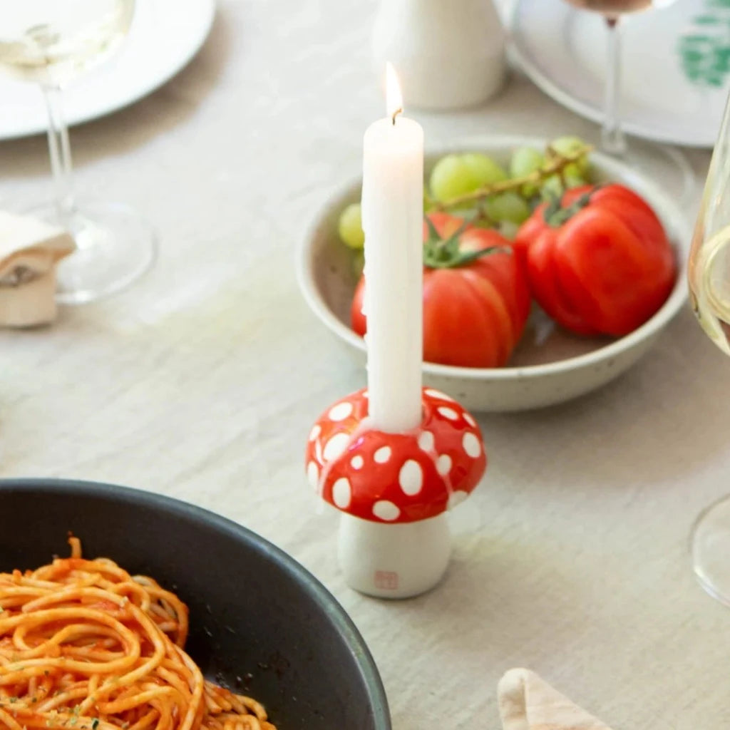 Add some whimsy to your home decor with this Ceramic Mushroom Taper Candle Holder. Its red and white design features playful polka dots and a quirky mushroom top. Sold individually, this holder is the perfect addition to any candle collection.