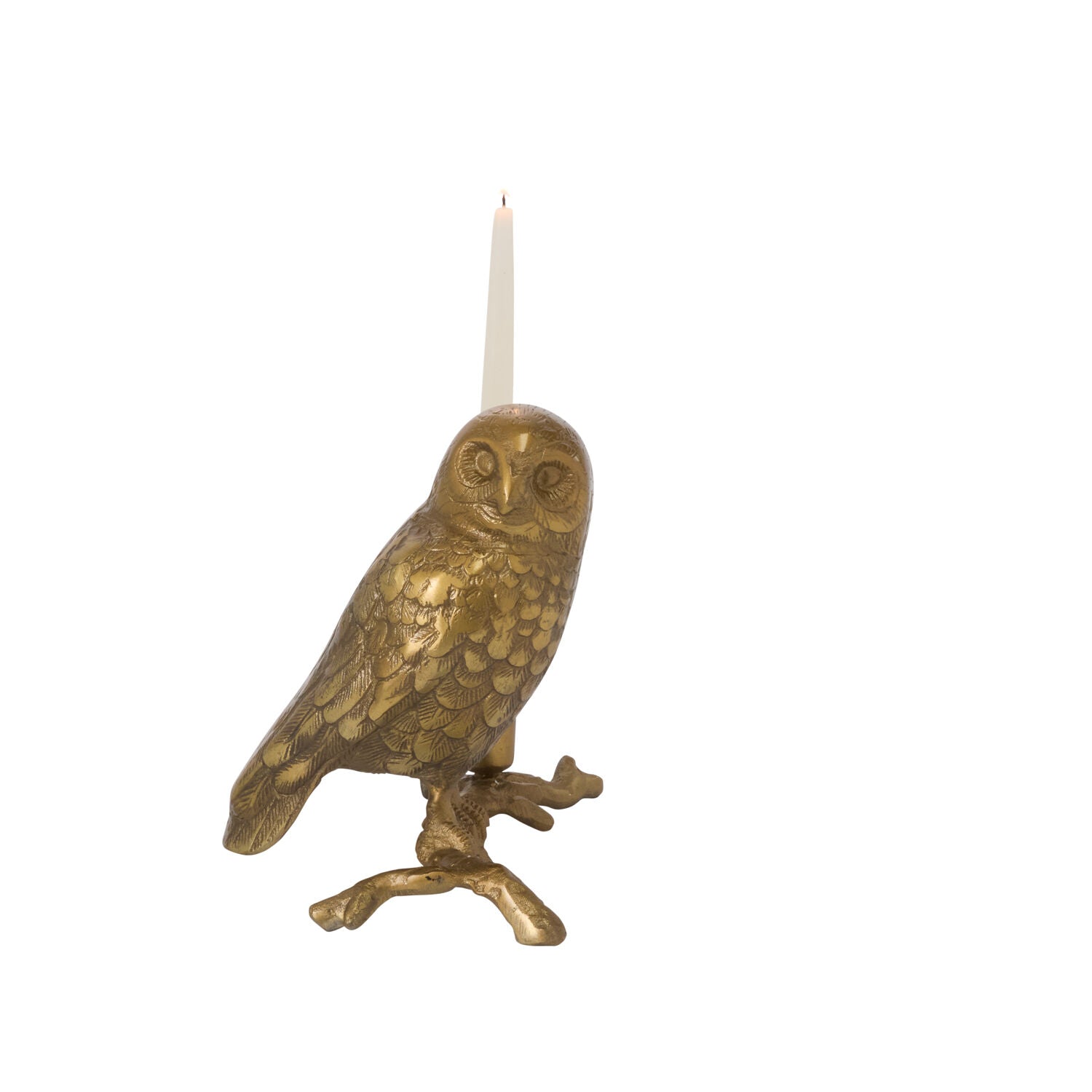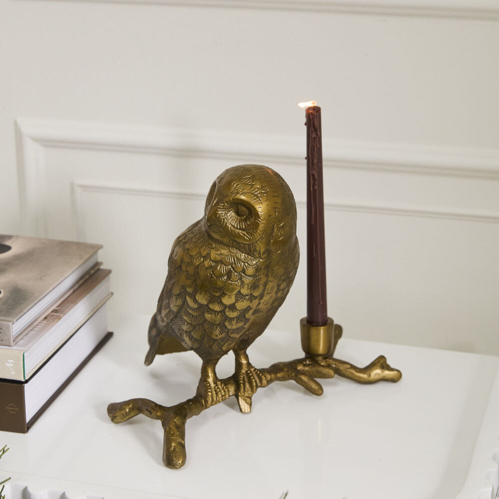 Bring a touch of woodland charm to any room with the Owl's Watch Taper Candle Holder. This life-sized owl, perched on a winter branch, comes alive with intricate details and a warm antique gold finish. The sturdy cup-shaped taper holder beside the owl lets you easily add a candle, casting a cozy, enchanting glow that brightens your space with nature’s beauty and cheer.