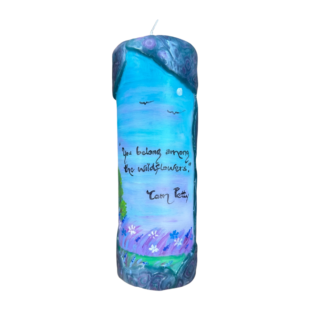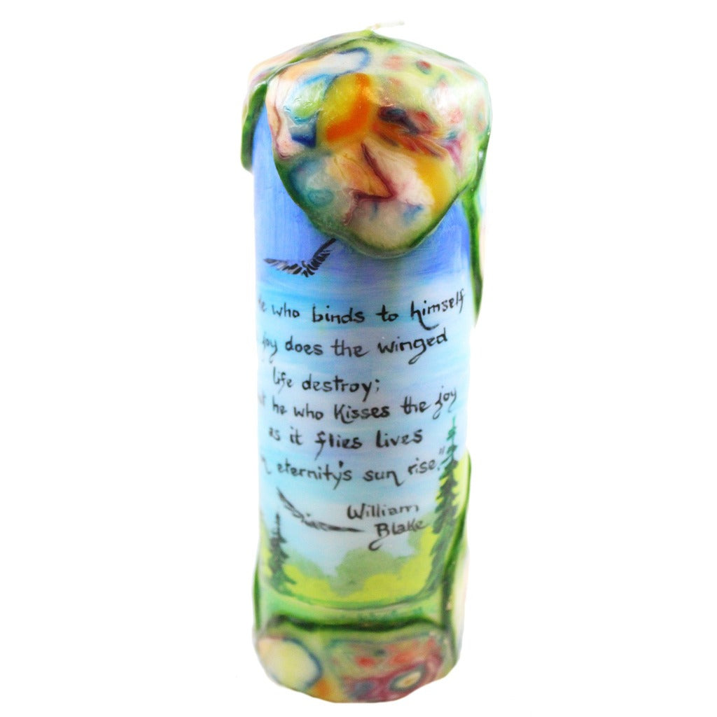 Candlestock has been supporting the beautiful art of local artisans since its opening in the 70s. Each painted pillar candle is carefully crafted by hand and then painted by hand. The same New York local artist has been painting these pillar candles since the Candlestock's founding. The veneer wrapping on each hand painted pillar candle is crafted by hand. As the candle burns the veneer and painting will remain and glow like stained glass lit by sunlight.