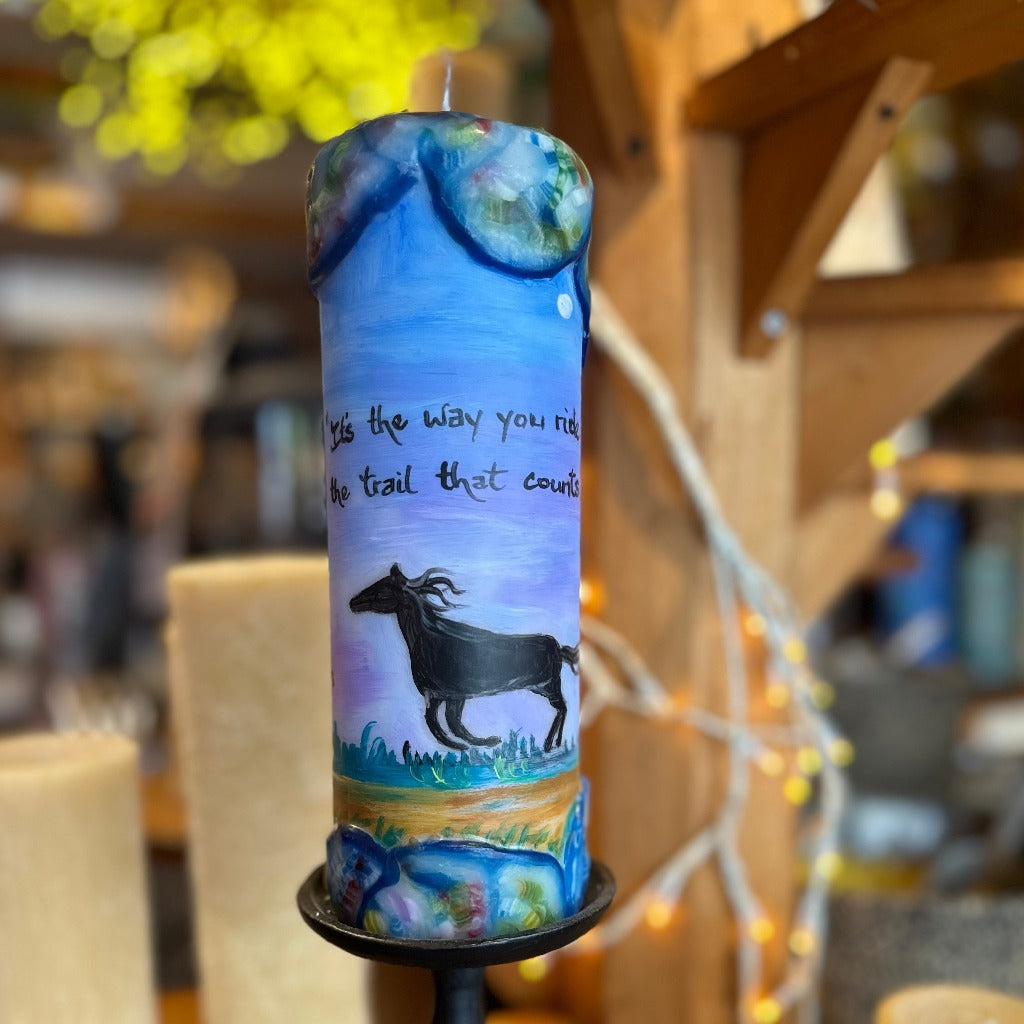 Candlestock has been supporting the beautiful art of local artisans since its opening in the 70s. Each painted pillar candle is carefully crafted by hand and then painted by hand. The same New York local artist has been painting these pillar candles since the Candlestock's founding. The veneer wrapping on each hand painted pillar candle is crafted by hand. As the candle burns the veneer and painting will remain and glow like stained glass lit by sunlight.