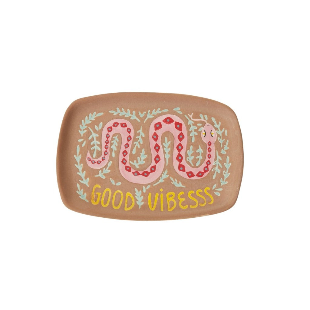 Adorable ceramic tray featuring a snake and the text "Good Vibes". Perfect for any of your favorite candles, jewelry, keys, or small house hold items.
