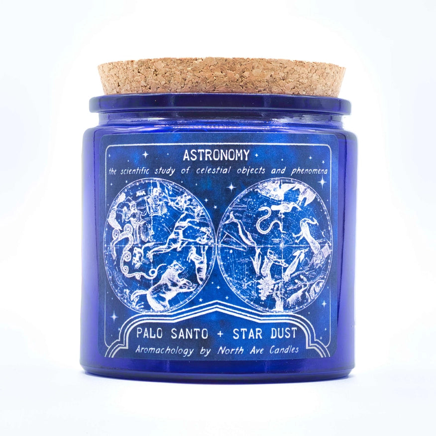 Indulge in celestial scents with North Ave Candles Astronomy Palo Santo & Star Dust candle. A harmonious blend of earthy Nag Champa and sweet, woodsy Palo Santo, this candle will take you on a journey through the night sky. Made with eco-friendly coconut-soy wax and featuring original label art of constellations, this candle is out of this world! (Only available on Earth.)