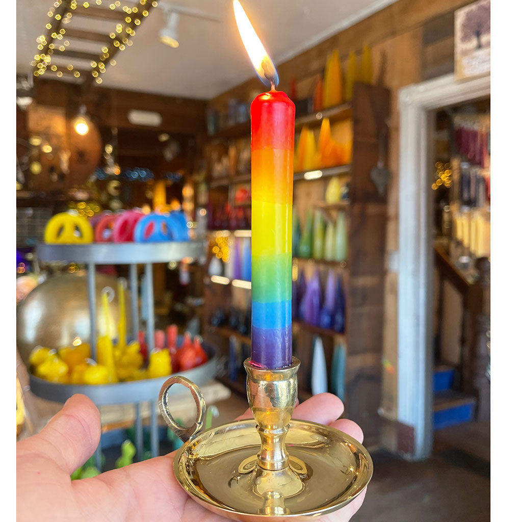 Adorable rainbow spell chime candles created by our very own candle makers here in Woodstock, NY. These taper candles will fit in any half inch taper candle holder and stand about 3 inches high.