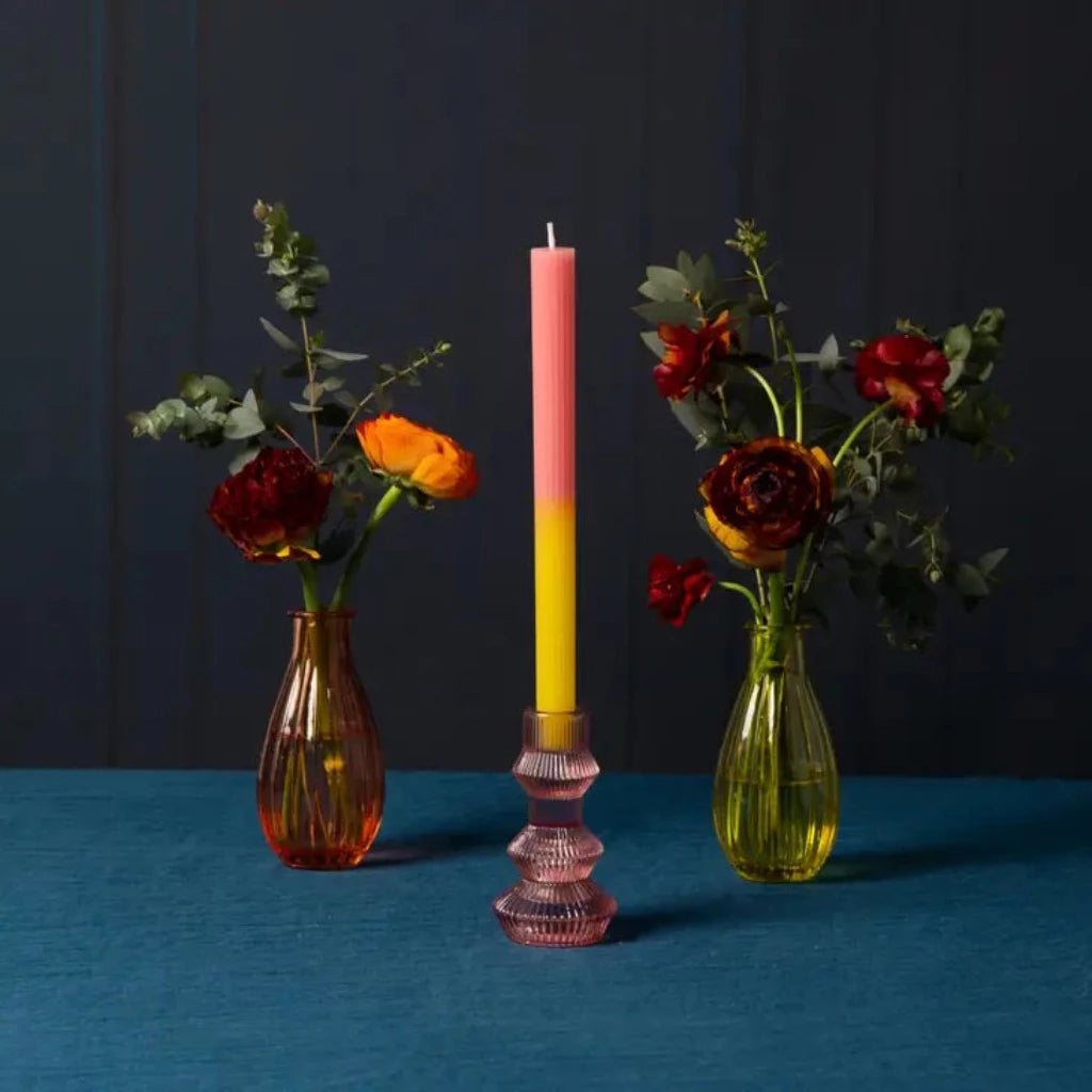 Beautiful 5 inch glass taper candle holders in a variety of vibrant colors. Perfect for adding a pop of color to your table top or home decor. These multi purpose taper candle holders can also be flipped over and used as a tea light candle holder or to hold your florals.
