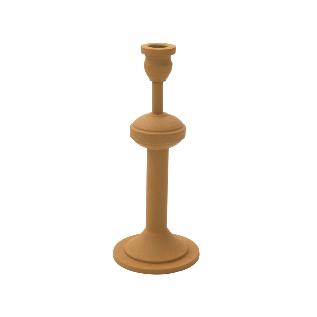 This taper holder is perfect for achieving that beautiful ambient aesthetic. Made out of metal and featuring a beautiful mustard color, this uniquely shaped piece easily holds any taper candles. Looks great on side tables, as centerpieces, or shelves.