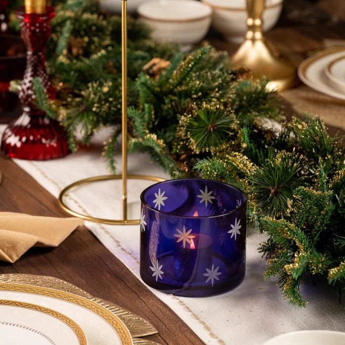Introduce a touch of seasonal magic with the Blue Glass Snow Star Tea Light Candle Holder. Made with precision, it features a serene blue hue that creates a tranquil atmosphere reminiscent of a snowy evening. Use as a centerpiece or accent piece to add winter charm and elegance to any space.