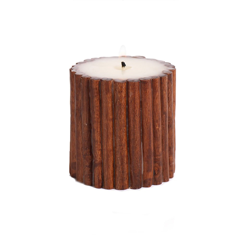 Bring a warm glow to your home with these unique cinnamon stick scented pillar candles. These cinnamon fragranced candles are encased in cinnamon sticks, creating a festive ambiance that will freshen up any room. Perfect addition to your fall or holiday decor.