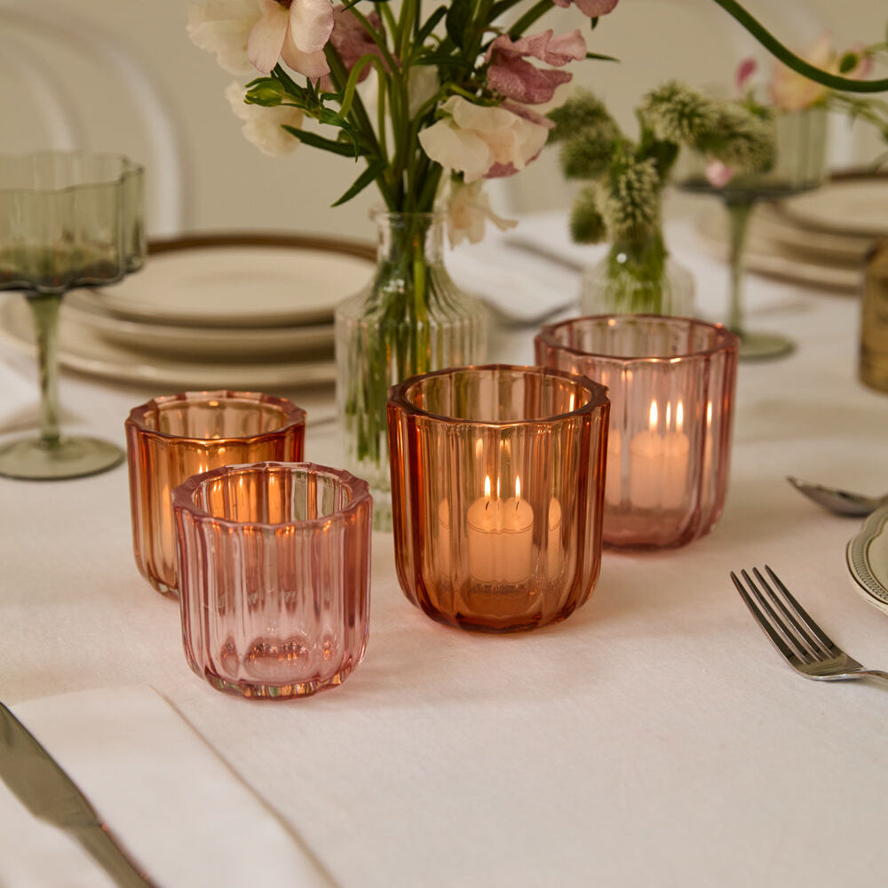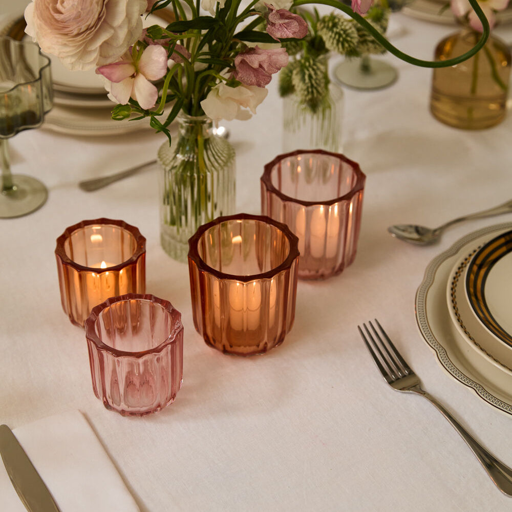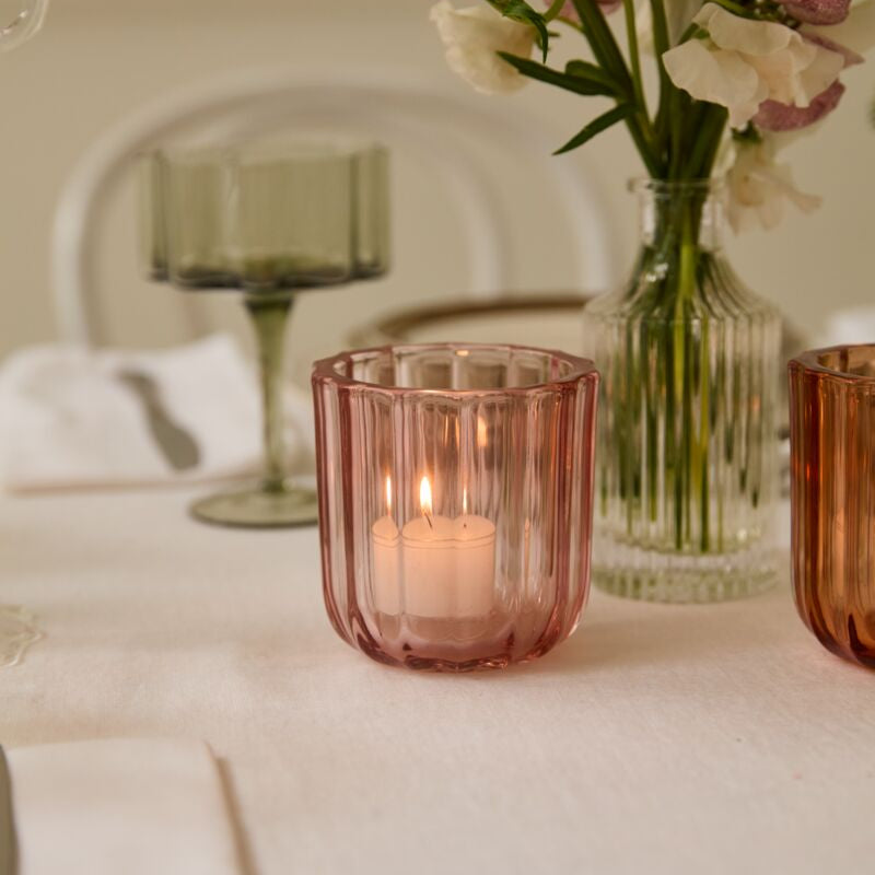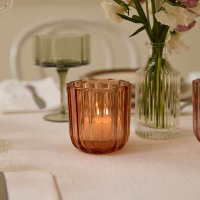Add a touch of modern charm to your space with the Tanger Glass Votive Candle Holder. Available in a trendy rose hue or vibrant orange with a ribbed surface, its thick glass design creates a cozy, fragmented glow that brightens any room. Perfect for elevating your tablescape with simple elegance and warm flickering light.