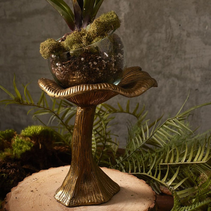 The nature inspired Mushroom Planter features a gold metal mushroom base that holds a glass bowl for planting. This fanciful design feels like it sprang up in the forest to hold a dreamy planting.