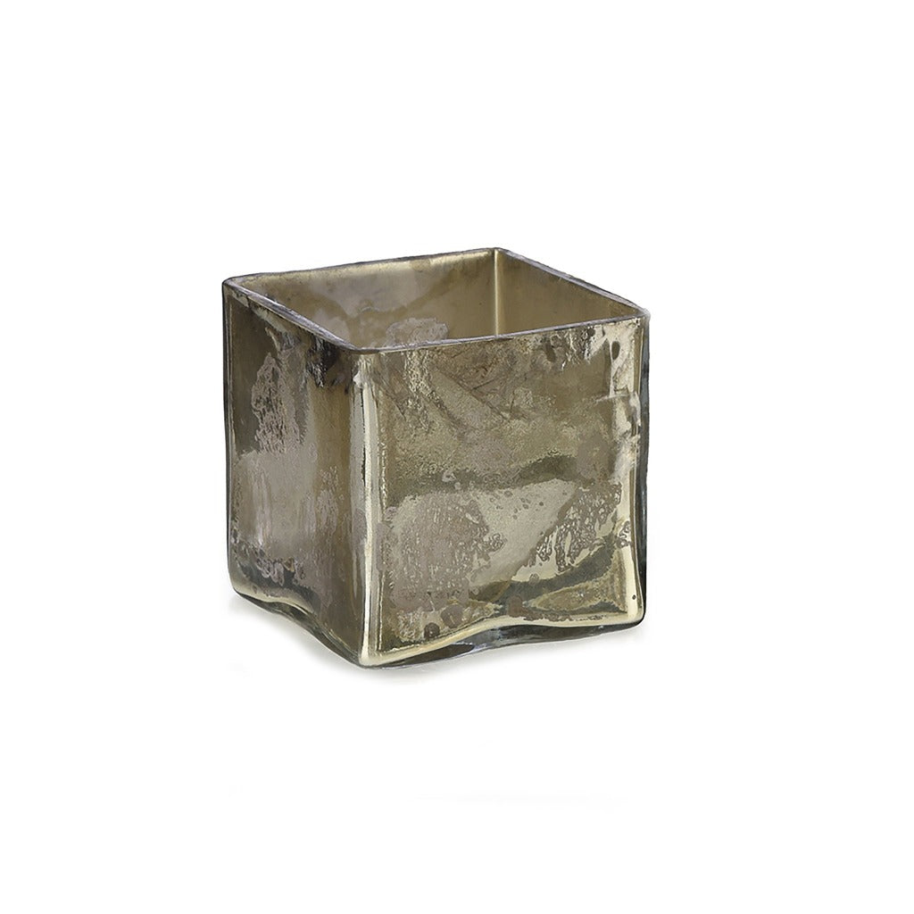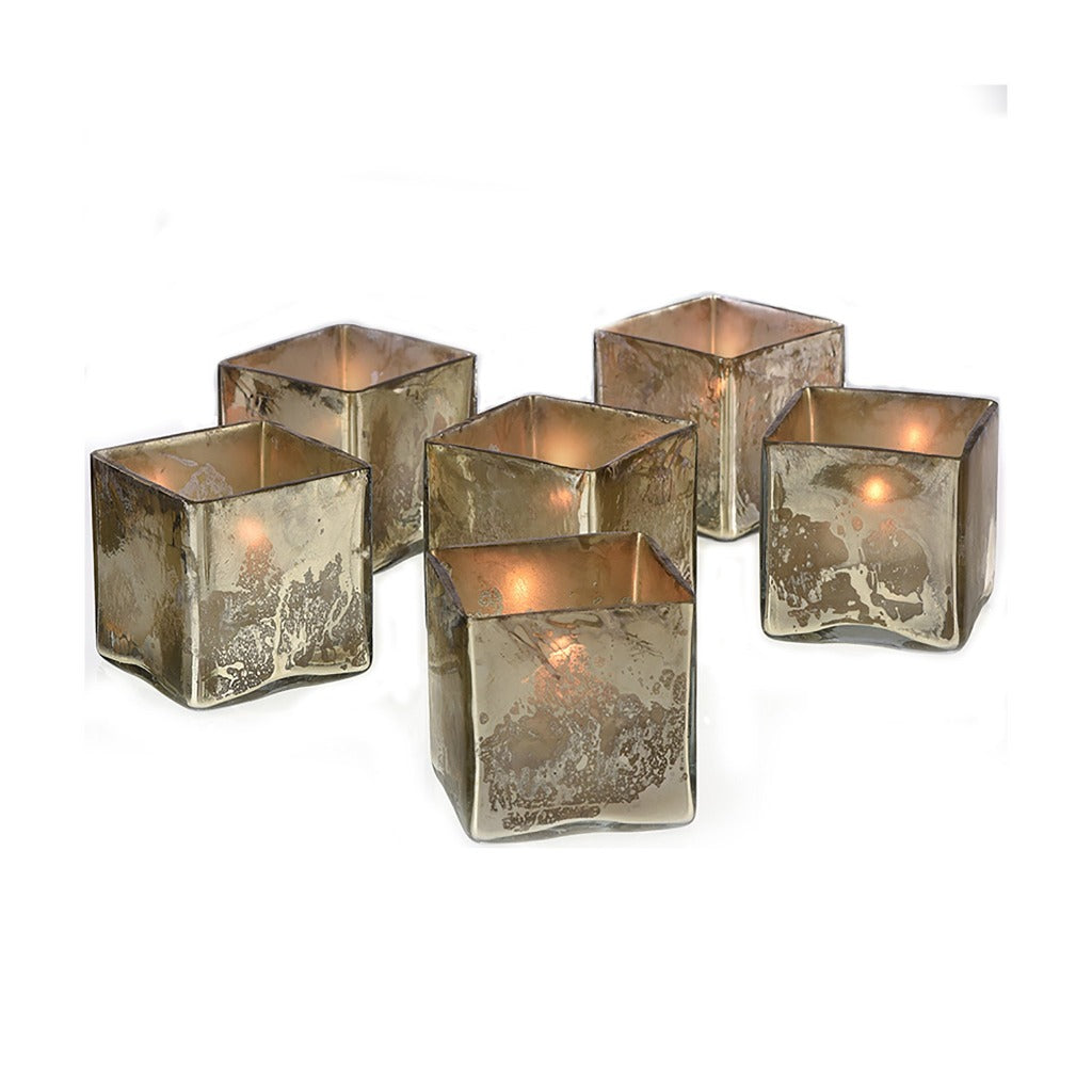 Add a warm glow to your home decor with these antiqued looking square mercury glass tea light candle holders. Just place your tea light candle inside for a warm and illuminating glow. Perfect piece to add a romantic touch to your wedding decor or just in your home.