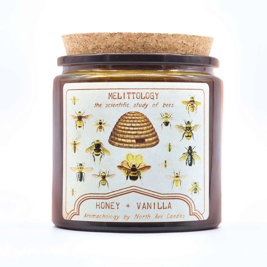 Indulge in the buzzworthy scent of North Ave Candles Melittology Honey & Vanilla Scented Jar Candle. Made with coconut-soy wax and featuring original label art inspired by vintage science diagrams, this double-wicked candle offers 80+ hours of cozy gourmand fragrance. Plus, with a cork-topped apothecary jar made from recycled glass, this candle is a sustainable and stylish addition to any home.
