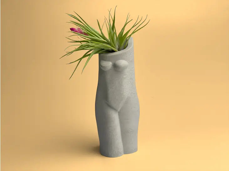 This beautiful cement Nude Female Body Vase is a unique and versatile addition to any home decor. This bud vase is perfect as a home accent or a housewarming gift for him or her. This Body Vessel can serve multiple purposes, from an air plant holder, dried flower vase, pencil holder to a cute mini cup for small items. It can class up your living room decor, bedroom, bathroom, or boho patio, and can be used both indoors and outdoors. This 100% concrete statue has a super smooth finish, making it visually appealing. tillandsia air plants, dried flowers, herbs, brushes, or pencils. It features a light grey cement color, adding a touch of sophistication to any space.