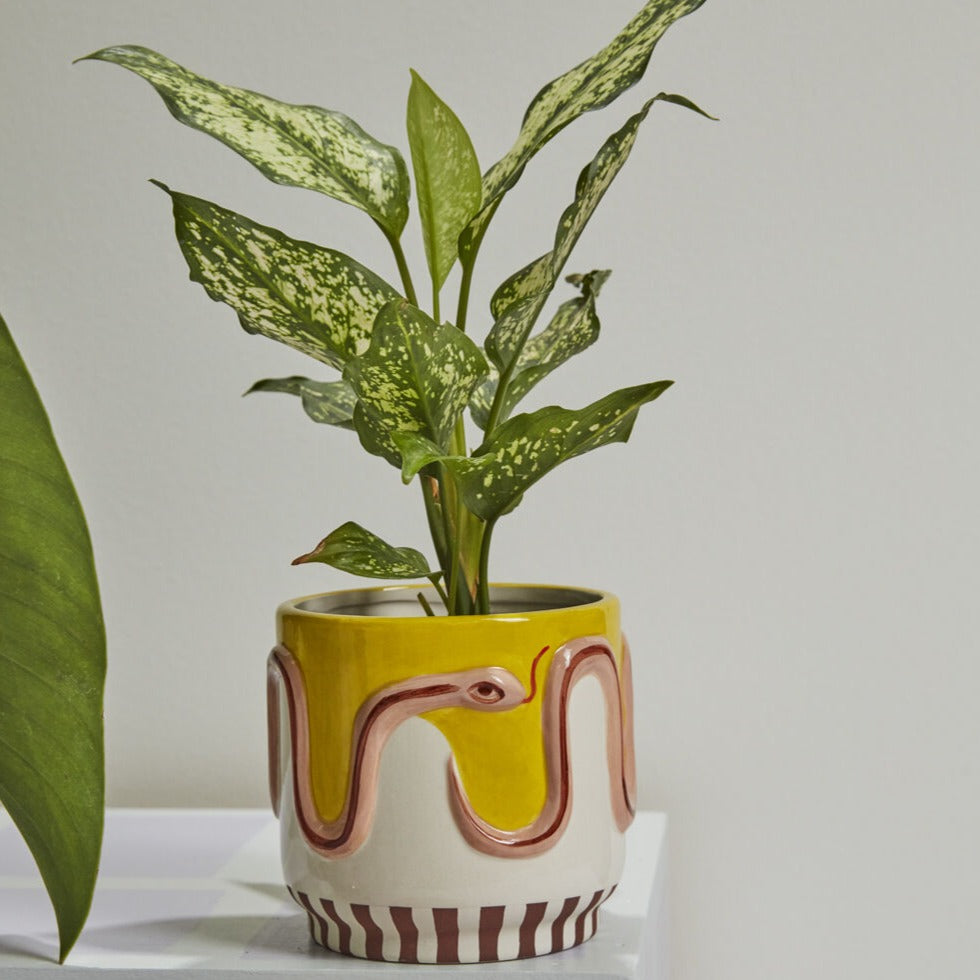 Add a touch of playfulness to your indoor plants with the snake Pot. This hand-painted ceramic planter features a charming snake design with watercolor details in ochre, coral, red, brown, and natural bisque stripes. Perfect for those who want to add a wild touch to their decor.
