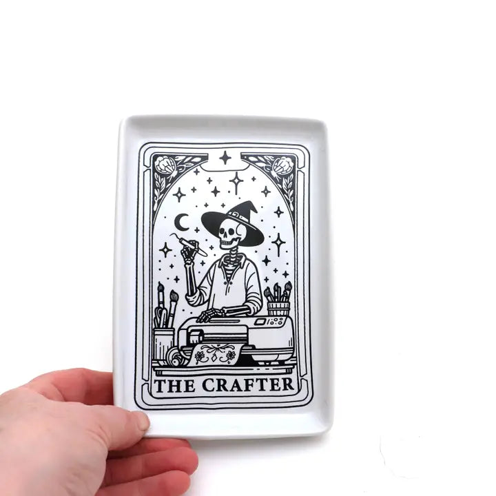 This charming ceramic tray, shaped like a tarot card called The Crafter, is as versatile as it is beautiful. Perfect for holding sage, soap, jewelry, candles, or even loose change, it’s also food safe. Crafted in New Jersey from lead-free, non-toxic materials and kiln-fired at over 2000 degrees, this sturdy stoneware resists chips and fading. Measuring 6 1/4 by 4 1/4 inches, it adds a cheerful touch to any space while keeping your essentials organized.