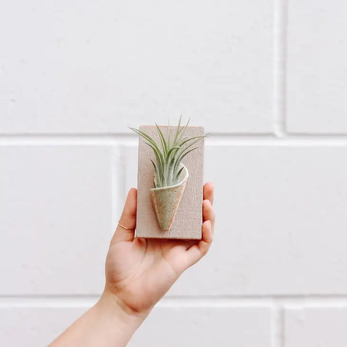 This ceramic and wood wall planter can hold air plants, dried flowers or artificial plants, adding greenery to any room. Planters are handmade out of a variety of Oregon clay, hand painted, and then secured to a wooden backing. Each wall planter has a self leveling hanger on the back for easy hanging.