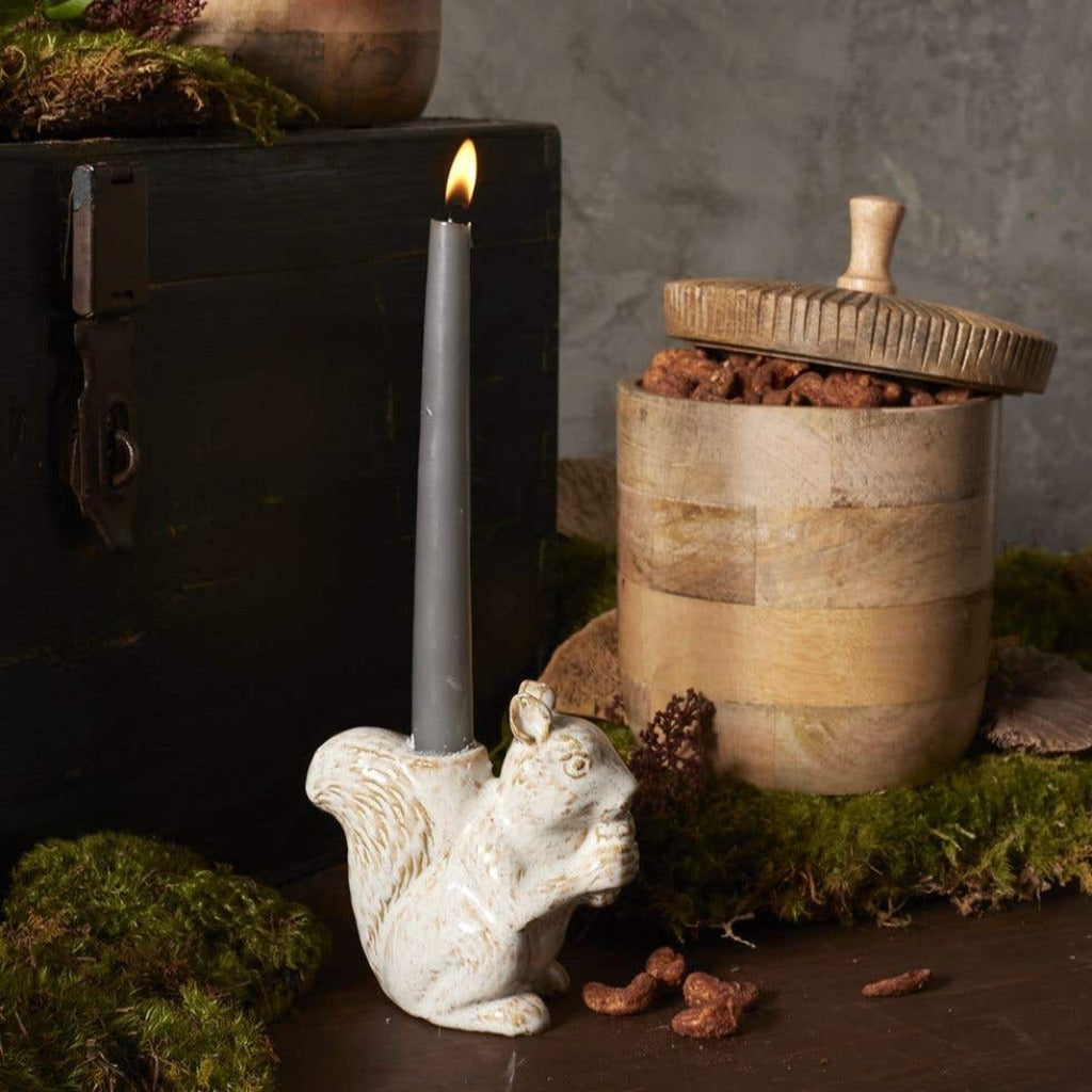 Bring some character to your mantlepiece with this Chippy Squirrel Taper Candle Holder. Crafted from ceramic with a natural bisque base and a grey glaze, this holder is perfect for adding a rustic touch to any setting. It is designed to securely hold a single taper candle with ease.