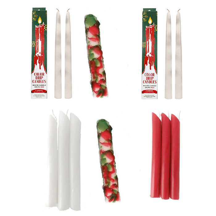With this purchase you will receive - 2 - 2 packs of multi colored Christmas themed drip candles, 2 Christmas Modern Art Drip Candles, 3 white drip candles and 3 red drip candles.