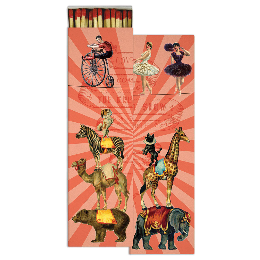 Light your candles with these traditional matches found within this decorative circus themed match box. Pair this match box with any of our candles and create the perfect gift!