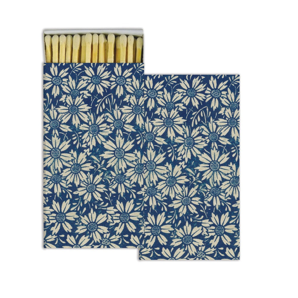 These matches will bring the spark to your candles and comes in a beautifully decorated case that can become a part of your home decor. This match box is decorated with ivory daises on a blue background.