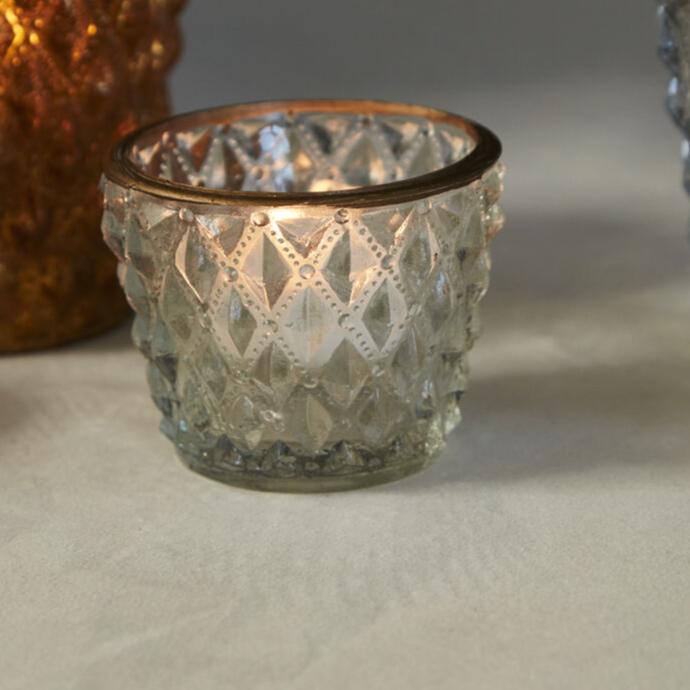Elevate your candlelit ambiance with our Crystaled Tea Light Candle Holder. The repeating diamond shapes and gold lip not only add a touch of elegance, but also amplify the glow of your candles. Enjoy a beautiful and cozy atmosphere with this stunning addition to your home decor.
