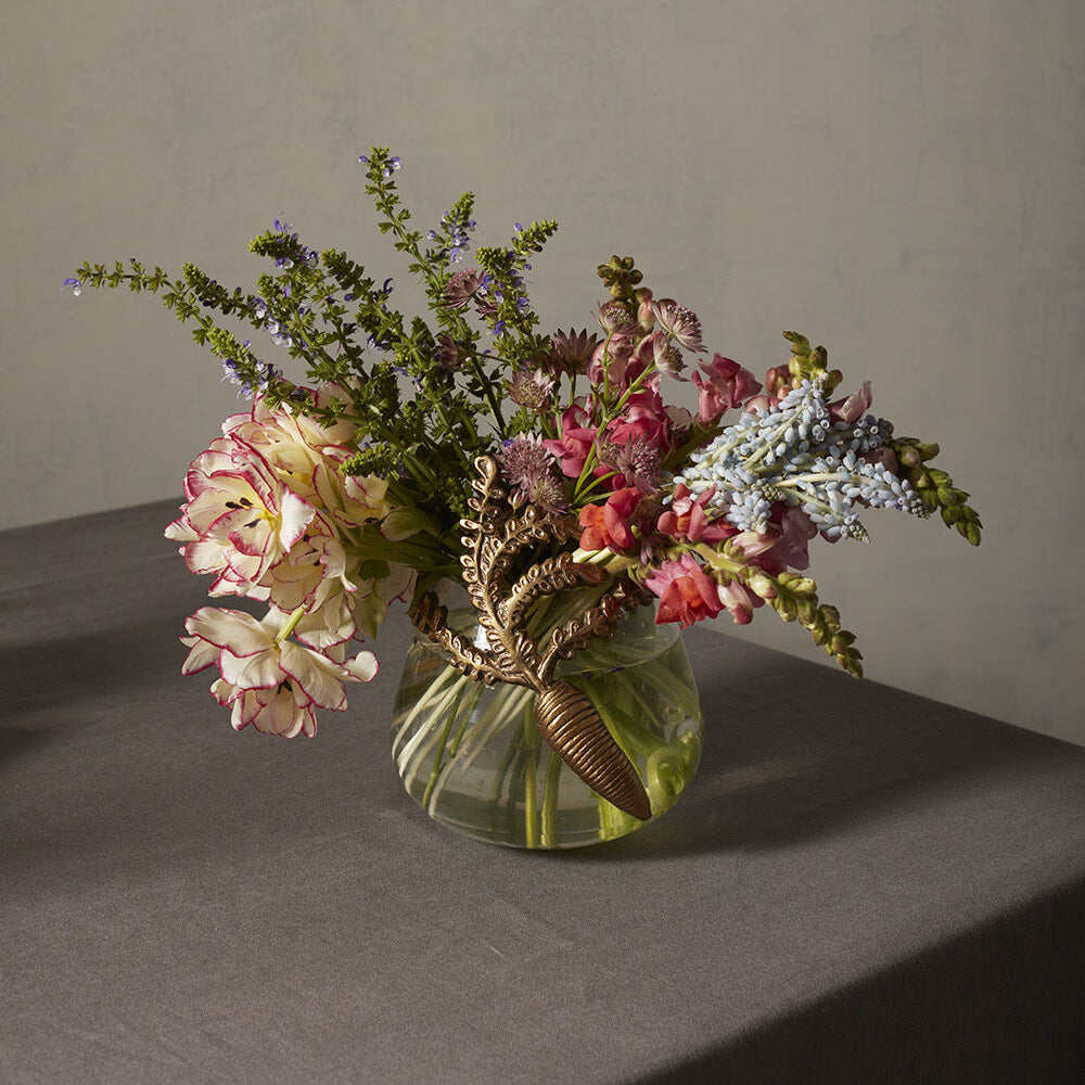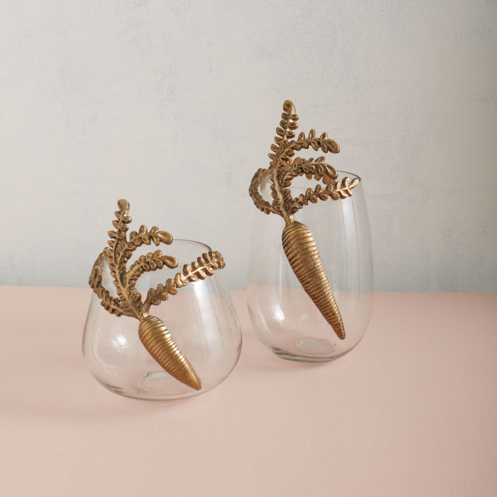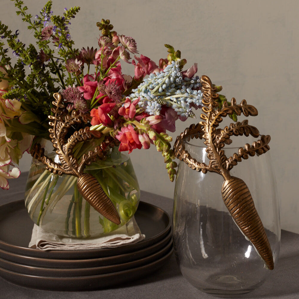 Elevate your Easter centerpiece and welcome spring with this Gilded Carrot Vase. Made of glass and accented with a cast aluminum carrot, its antique gold finish adds a touch of sophistication. Available in two sizes (sold separately) to perfectly complement your floral arrangement.