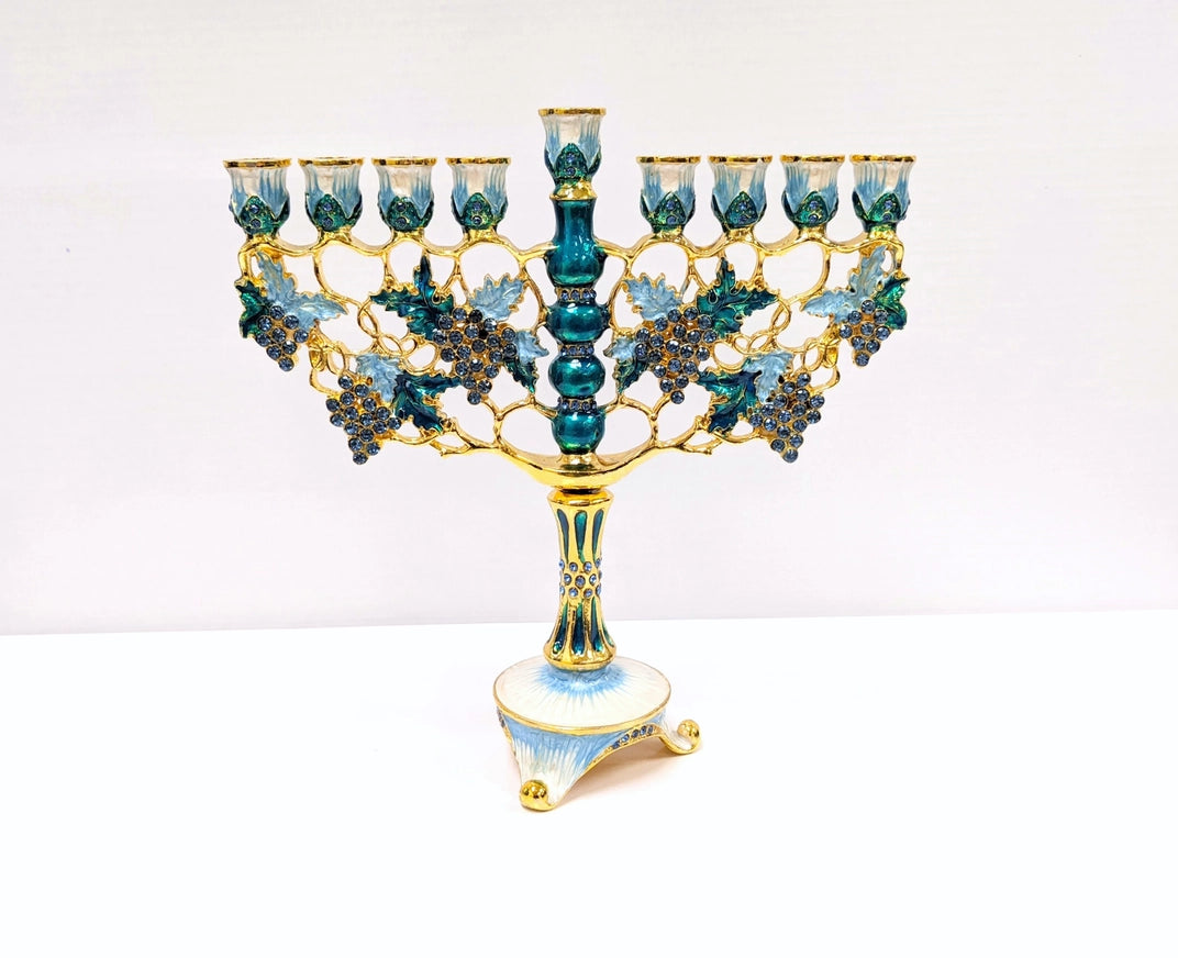 This Grape Menorah features beautiful crystals and realistic grape details. Embodying elegance and tradition, it's the perfect addition to any Hanukkah celebration. Made with high-quality materials, this menorah will be a cherished centerpiece for years to come. Celebrate in style with the Grape Menorah.