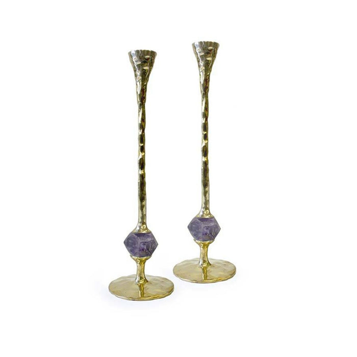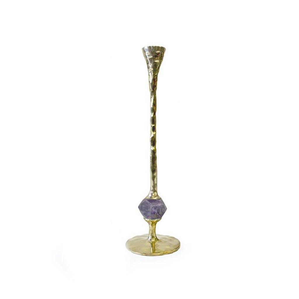 Display your taper candles in these elegant brass taper candle holders. These taper holders have an amethyst stone that sits delicately at the bottom of the holder that gives it a distinguished pop of color.
