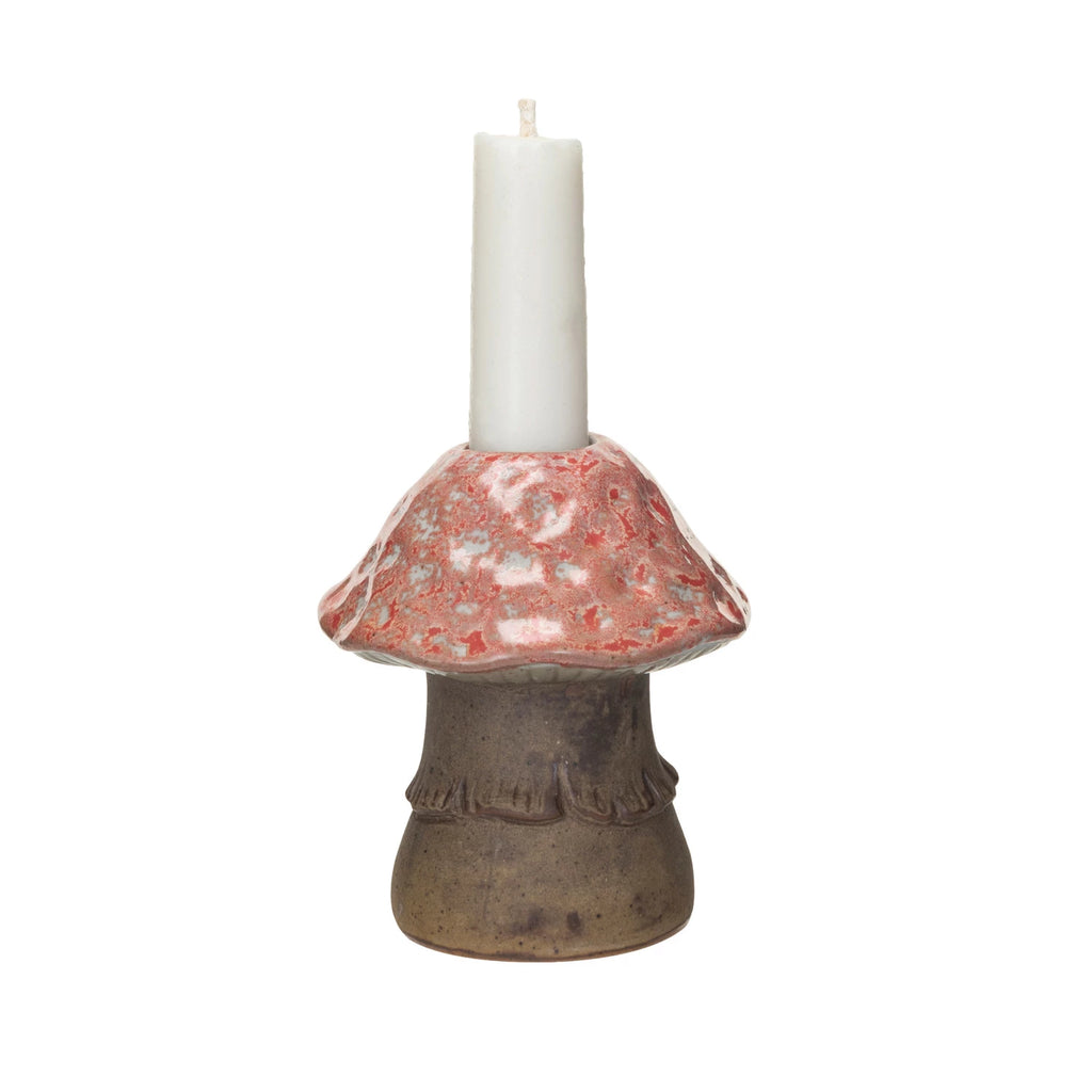 Elevate your space with this charming Hand Painted Mushroom Taper Candle Holder. Made from stoneware, it features a vibrant reactive glaze in red and brown, adding a touch of woodland charm to any room. At 3" round and 3.25" high, it's perfect for taper candles and creates a warm, inviting ambiance. A perfect gift or decorative piece to add a touch of whimsy to any decor.