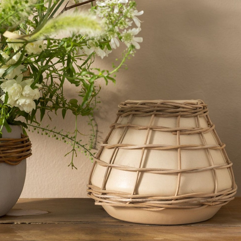 Speckled neutral-toned earthenware with woven rattan accents makes this lissome vase a perfectly on-trend yet timeless piece.Perfect for plants or dried naturals to add texture and easygoing style to the home or shop.