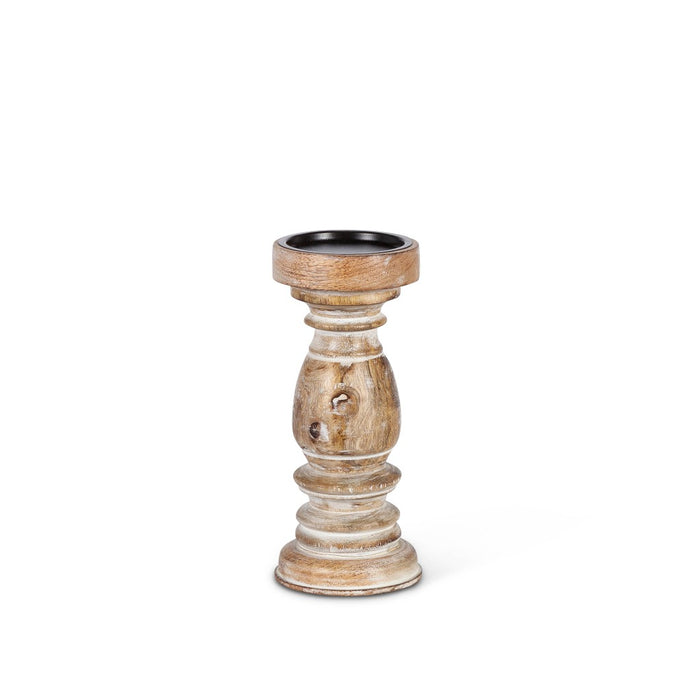Beautiful white washed mango wood pillar candle holder. Perfect for holding any candle up to 3.5 inches in diameter.