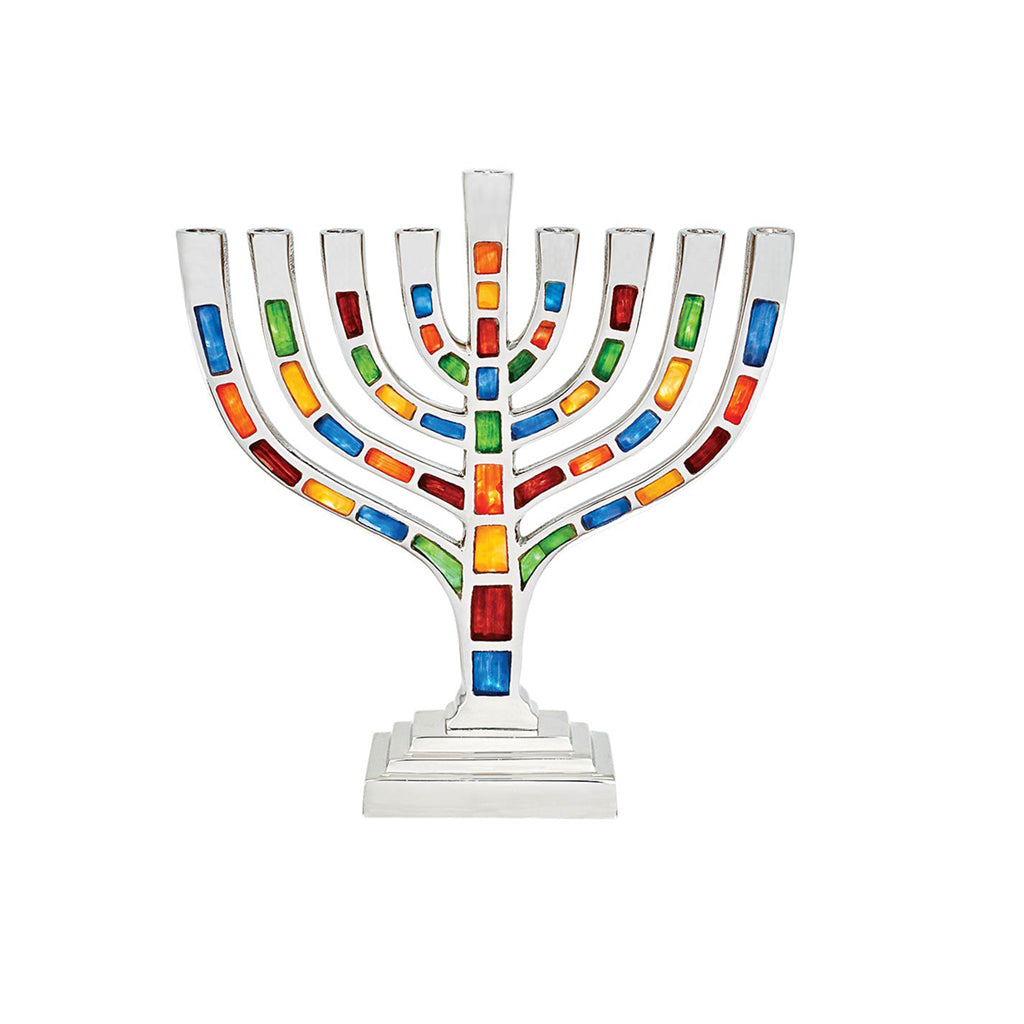 Add some color to your holiday this year with this beautiful multi jeweled Kenesset style Mosaic aluminum Menorah.