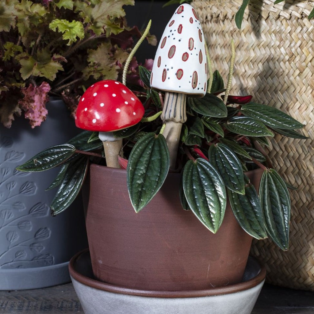 Crafted from high-quality ceramic, these garden stakes are durable and will withstand outdoor elements. The red mushroom measures 2 inches in length and 6.5 inches in height, while the white mushroom measures 1.75 inches in length and 7.5 inches in height.