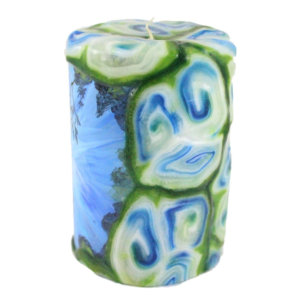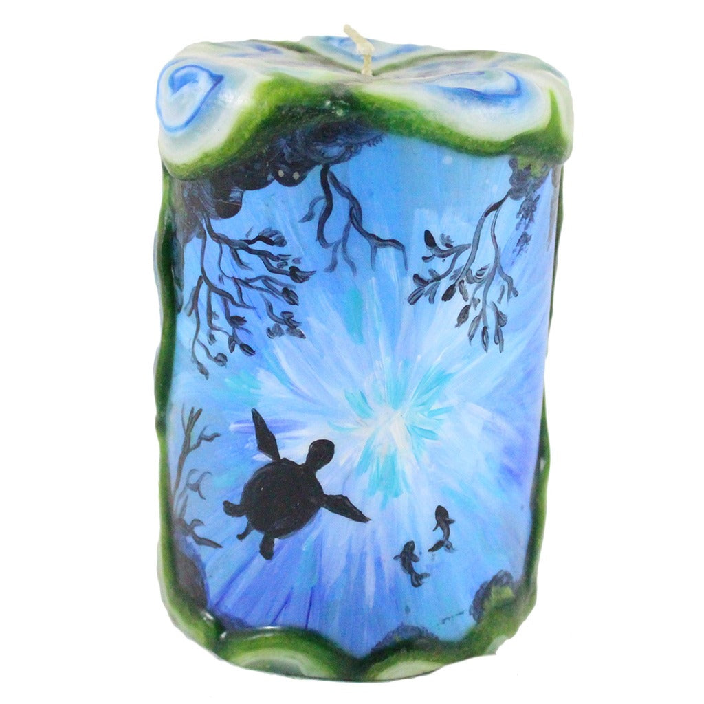 Bring a piece of locally made artwork to your home decor with this handmade and hand painted pillar candle. This pillar candle is painted with an underwater scene featuring a sea turtle and two fish. Great as a gift for any ocean or turtle lover.