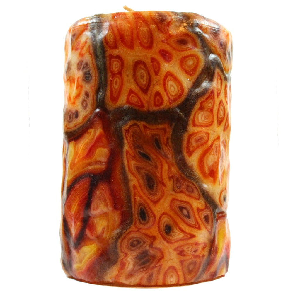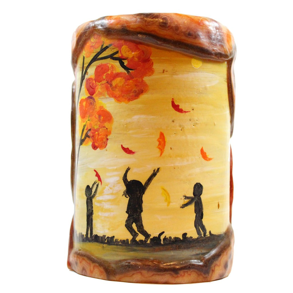 Brighten your home with this locally handmade and hand painted pillar candle wrapped in colorful veneer. This pillar candle has a children playing in Fall leaves silhouette design. As this pillar candle burns down, the outer design and veneer will remain and glow like stained glass. Add this candle to your home decor or give it as a beautiful long lasting gift.