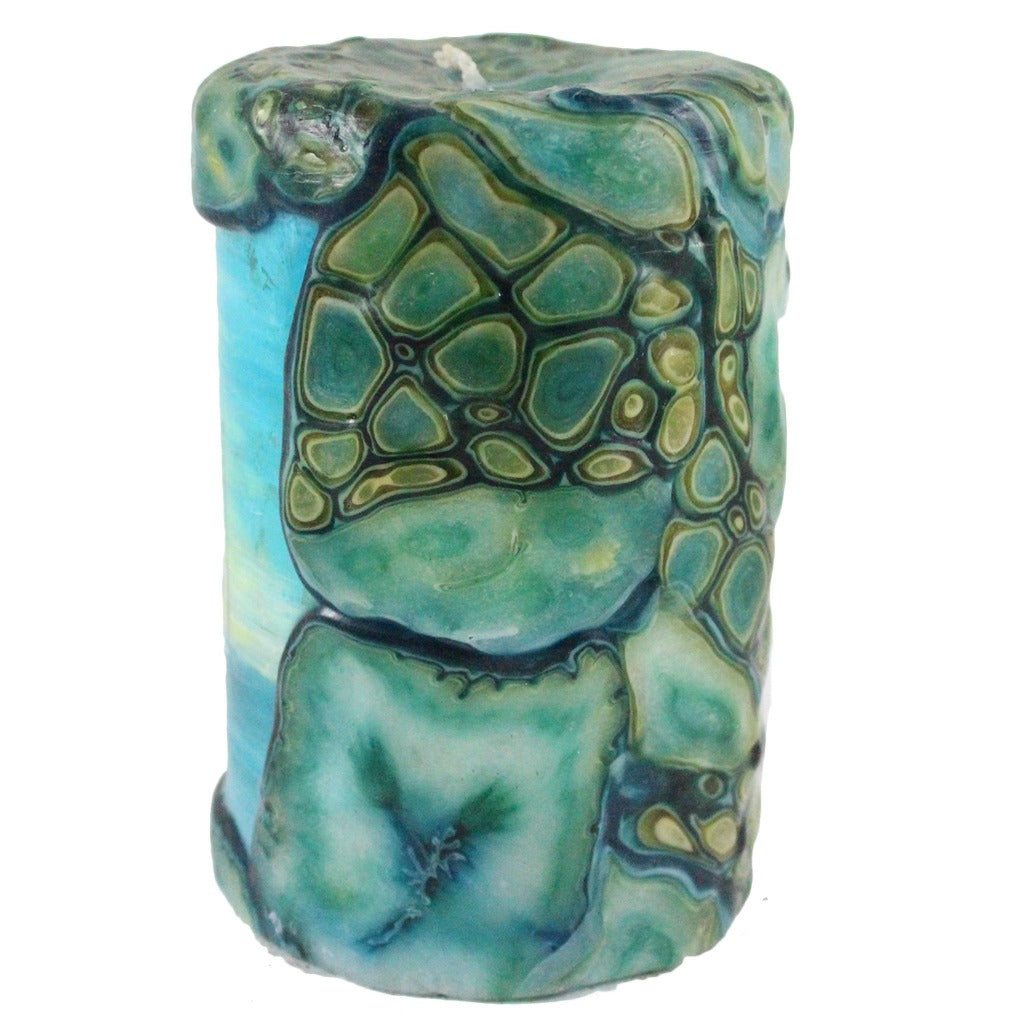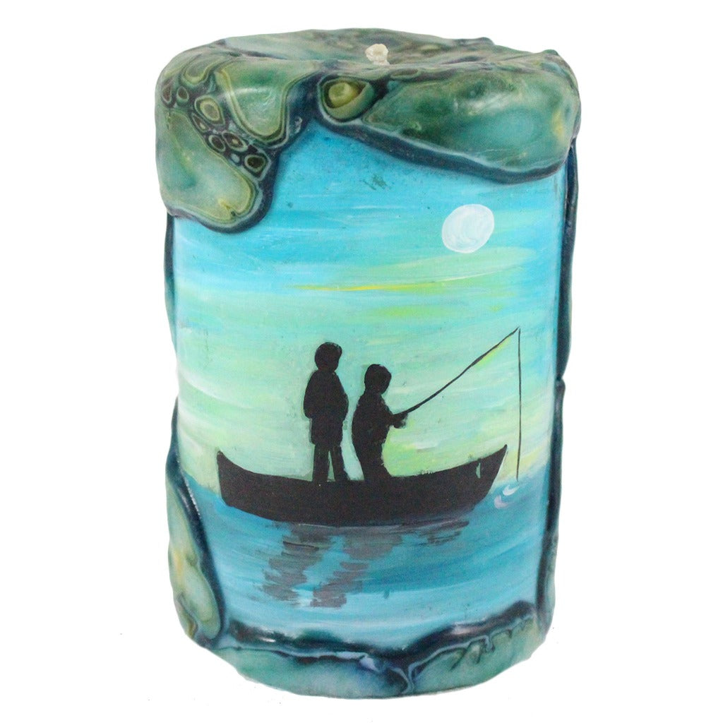Brighten your home with this locally handmade and hand painted pillar candle wrapped in colorful veneer. This pillar candle is painted with a couple fishing on a lake silhouette design. As this pillar candle burns down, the outer design and veneer will remain and glow like stained glass. Add this candle to your home decor or give it as a beautiful long lasting gift.