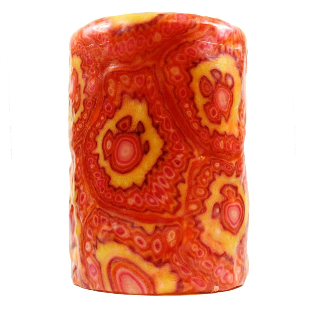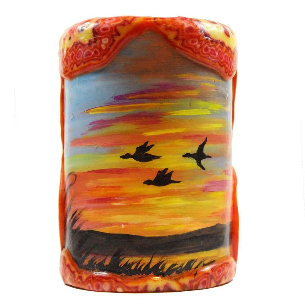 Brighten your home with this locally handmade and hand painted pillar candle wrapped in colorful veneer. This pillar candle is painted with a colorful sunset and flying geese silhouette scene. As this pillar candle burns down, the outer design and veneer will remain and glow like stained glass. Add this candle to your home decor or give it as a beautiful long lasting gift.
