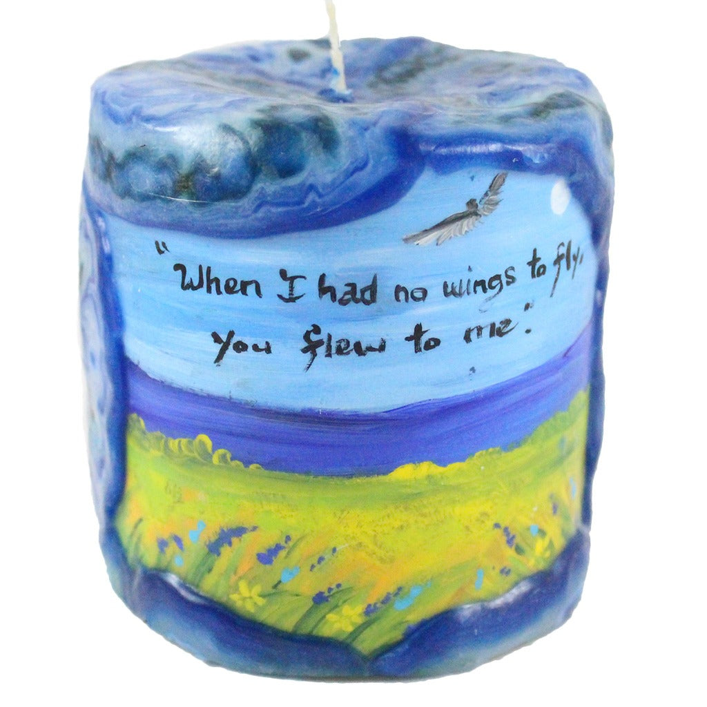 Painted Veneer Pillar Candle - "When I had no wings to fly, you flew to me." 4X4