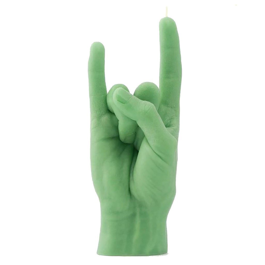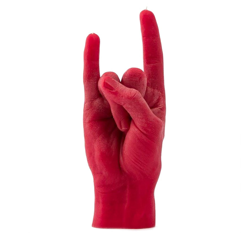 Keep rock and roll alive with this life sized candle hand in the rock on gesture. Coming in a variety of vibrant colors this candle will add a pop of color to any home. A perfect piece that'll bring the 70s vibe into your home.