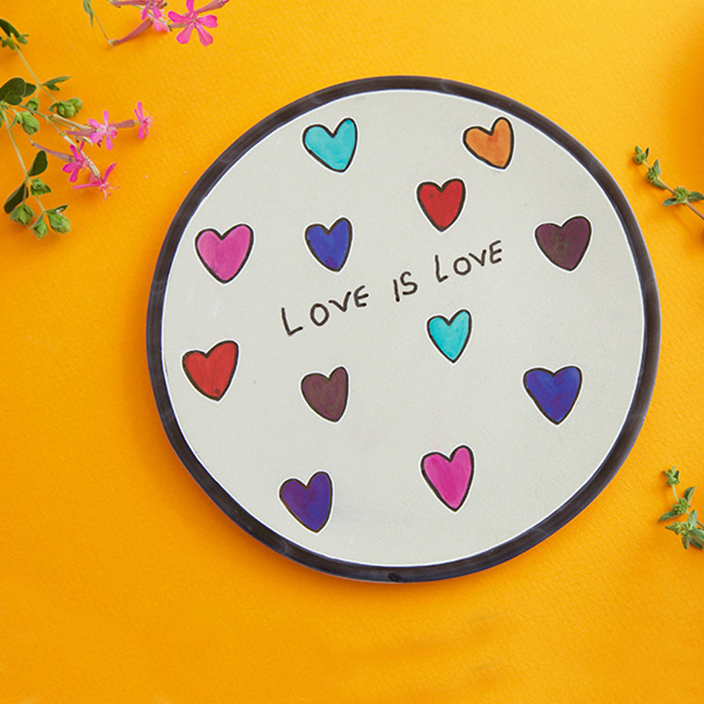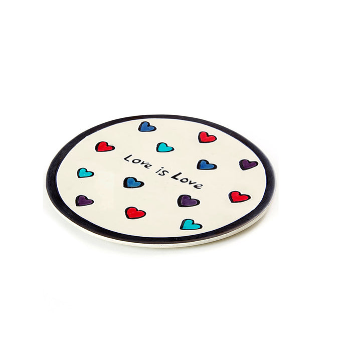 This beautiful handmade soapstone candle tray is the perfect piece to hold your candles or small house hold items. Created by Kenyan artisans, this beautiful piece is hand painted with colorful hearts and the saying "Love is love"