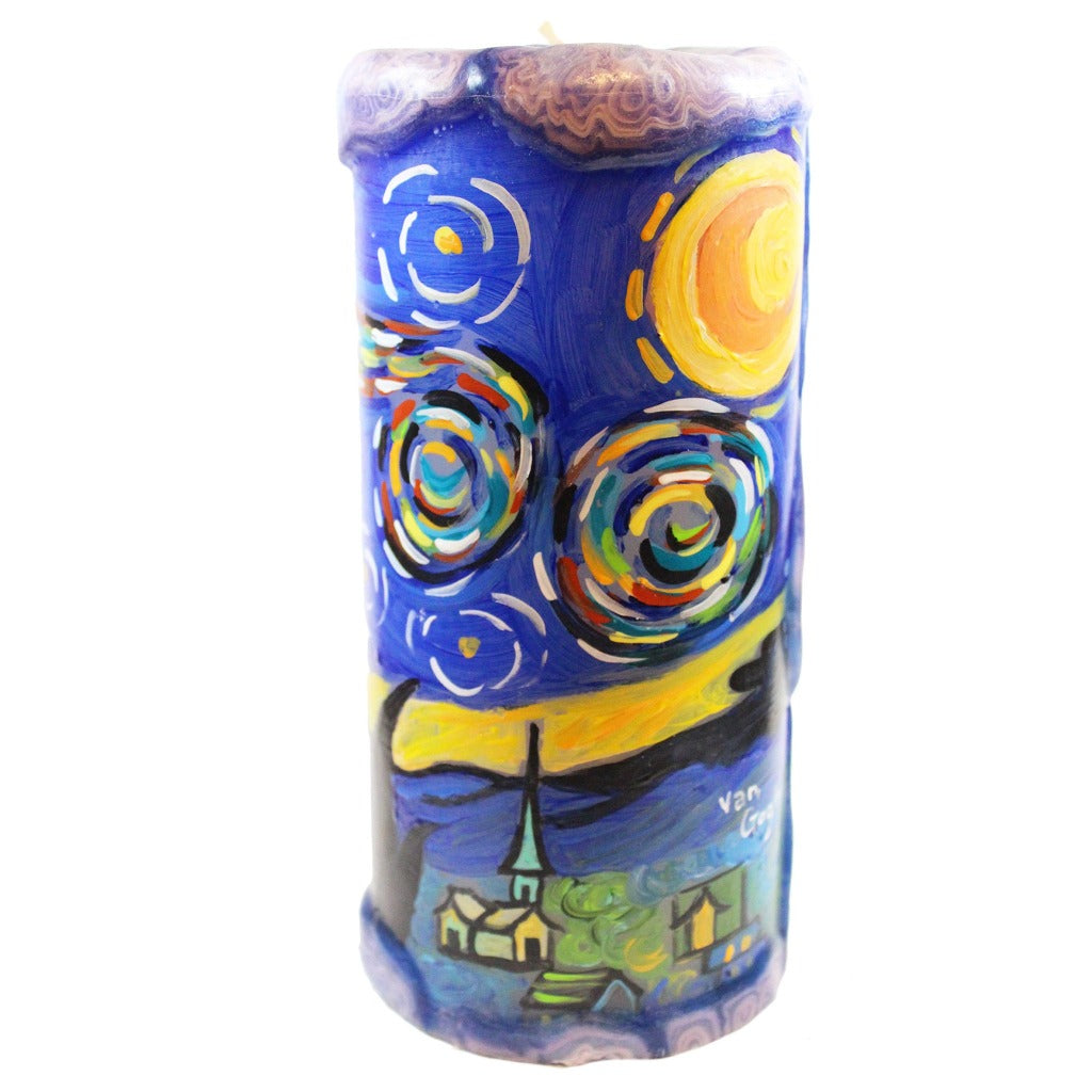 Bring home a Van Gogh masterpiece with this handmade and hand painted veneer wrapped Starry Night Van Glow pillar candle. This candle is lovingly hand painted by a local artisan. As this painted veneer pillar candle burns down the outer veneer and design will remain and glow bright.