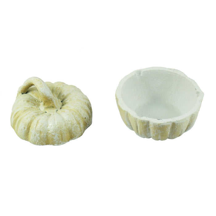 Hold your favorite house hold trinkets or spices within this white rustic cast iron pumpkin jar. This white pumpkin is perfect for seasonal decorating and would look good on any table top, or thanksgiving table.