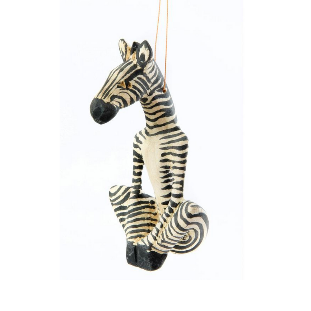 Kenyan wood carvers hand carve a playful ornament in jacaranda wood, portraying a Zebra as a yogi in a lotus pose. The attached string makes it easy to hang this unique ornament on the holiday tree or anywhere in the home, office or studio.